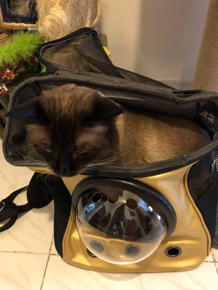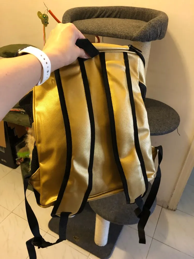 Рюкзак оказался небольшим. Пятикилограммовому коту там не удобно. Может только сидеть, и то втянув голову в плечи. Сумка не держит форму и цвет оказался не тот. Я покупала коричневый, а оказалось, что он золотой. Лямки не выглядят надежными. Не уверенна, что будем им пользоваться.