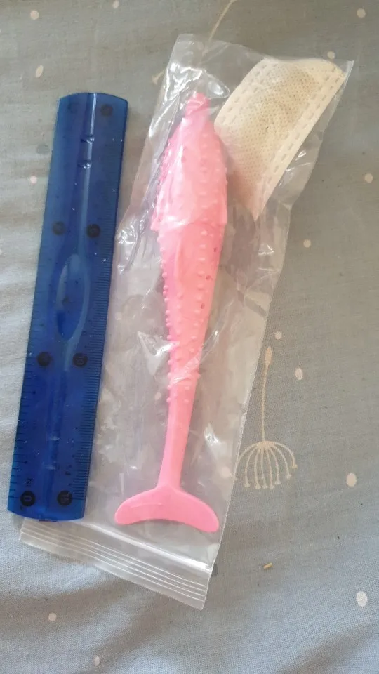 Cute dolphin, 15 cm, inside as promised 2 bags of mint, description exact, silicone does not smell, it came quickly 17.05 ordered, and 9.06 already received, the track was tracked completely, I did not communicate with the store.