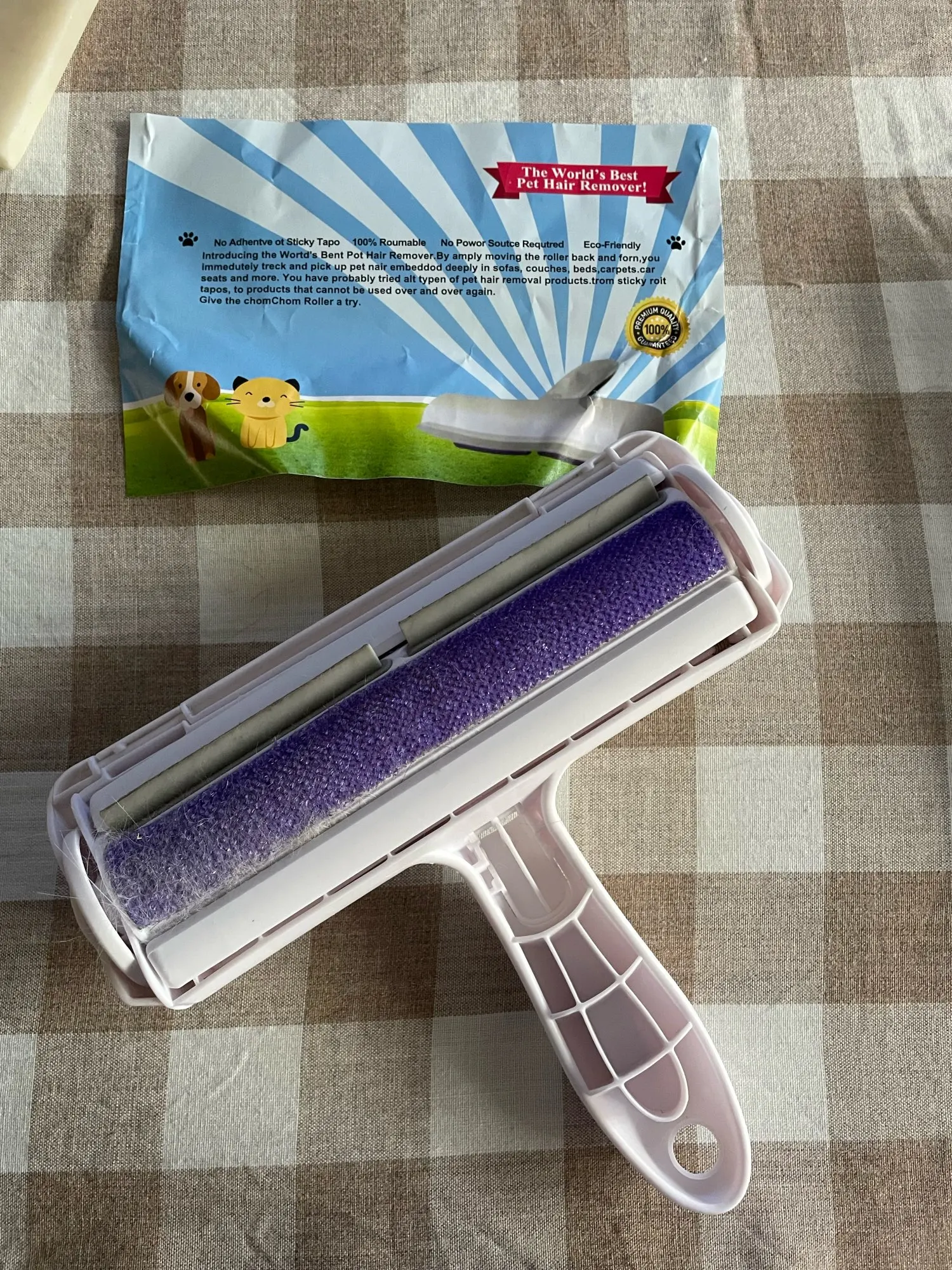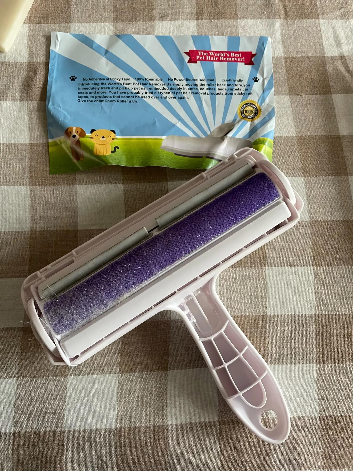 the roller works perfectly! I just need a bigger one for all the hairs of my dog it's a pity that one of the 2 wheels is broken and it takes off easily during rolling. delivered in only 14 days