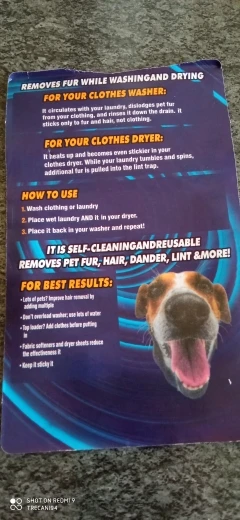It removes pet hair from your clothing while you wash and dry your clothes. Works in both washer and dryer, this pet hair remover is made from a very soft, tacky, flexible material that grabs the dog or cat fur and hair, pulls it from the clothes, and washes it down the drain or into your lint trap. It is also safe for your clothes, pets, and children. Order now!