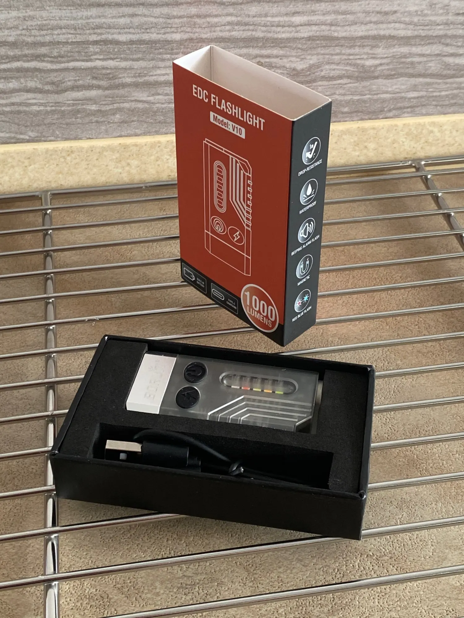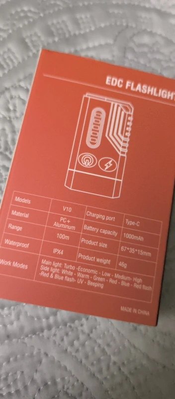 Nice flashlight, decendly powerful with plenty functions. The V3 model is superior to V10 in my opinion if you are deciding between these two (and V10 is like 25% larger). The 100 lumens advatage from the 900 lumens V3 is unnoticable. Super fast delivery. Excelent choice for regular urban EDC.