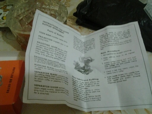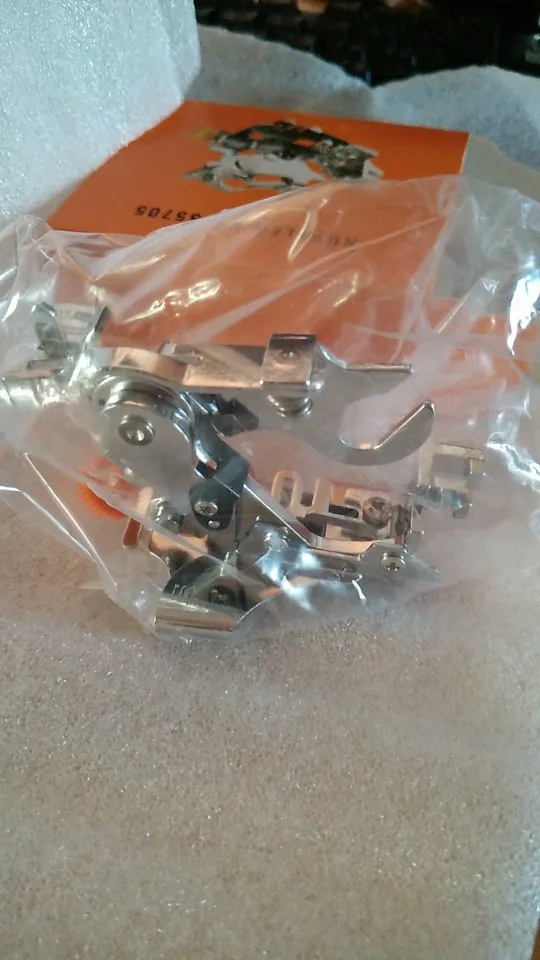 The foot came in the bag. All whole, packed well. Instruction in English. On the machine Janome 7522 fit. The fabric is oblique collects well.