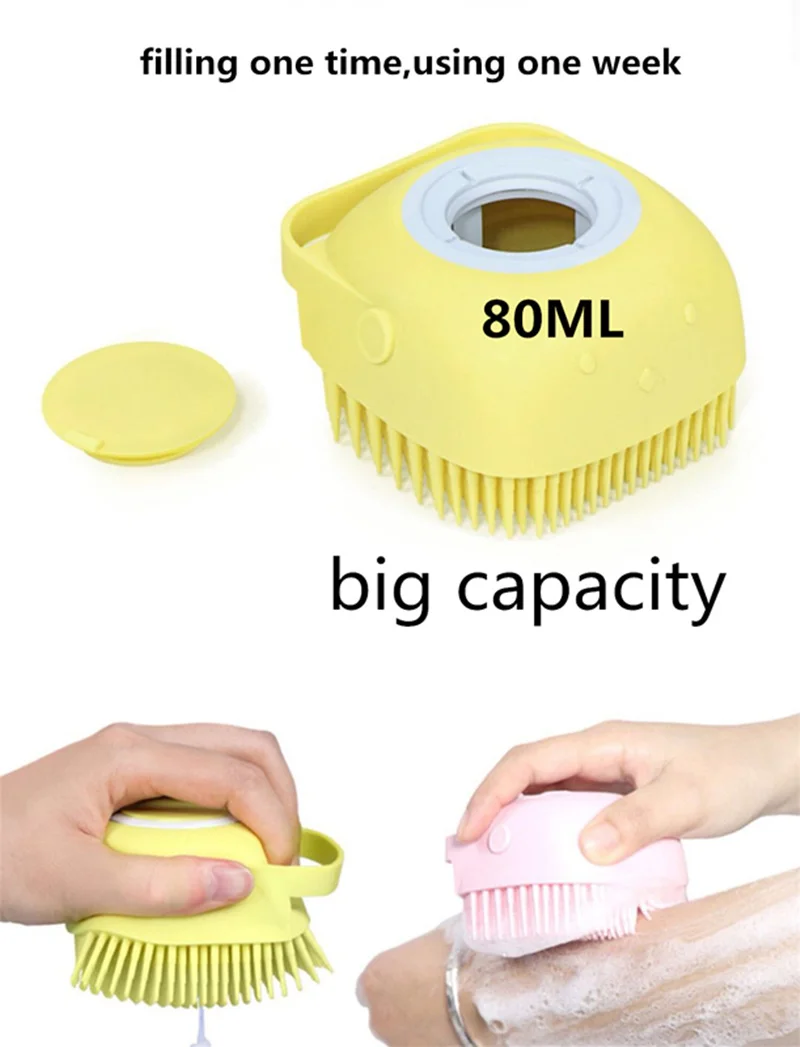 First, squeeze slightly and the shampoo can easily come out, then use the dog shower brush scrub away dirt, remove dead skin and loose fur, bring your dog a very comfortable bath and massage soothing effect