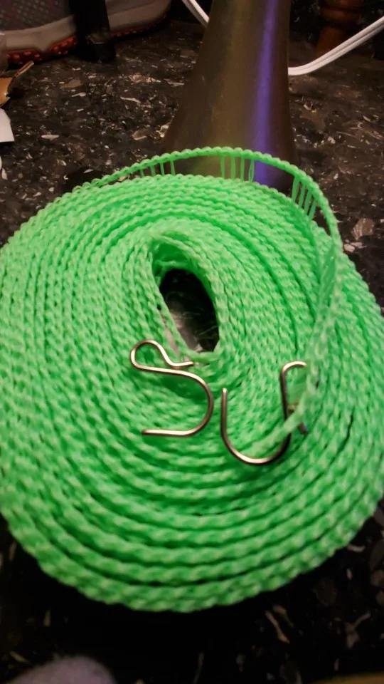 HOW TO CHOOSE There are all sorts of drying line setups, but all you really need is a length of clean, strong clothes rope that you can tie between two trees or poles easily. It is of good quality at affordable prices. Each one is 5 meters long(16.4FT), 2.5oz weighs only. Easy to untie or retie by hooks.