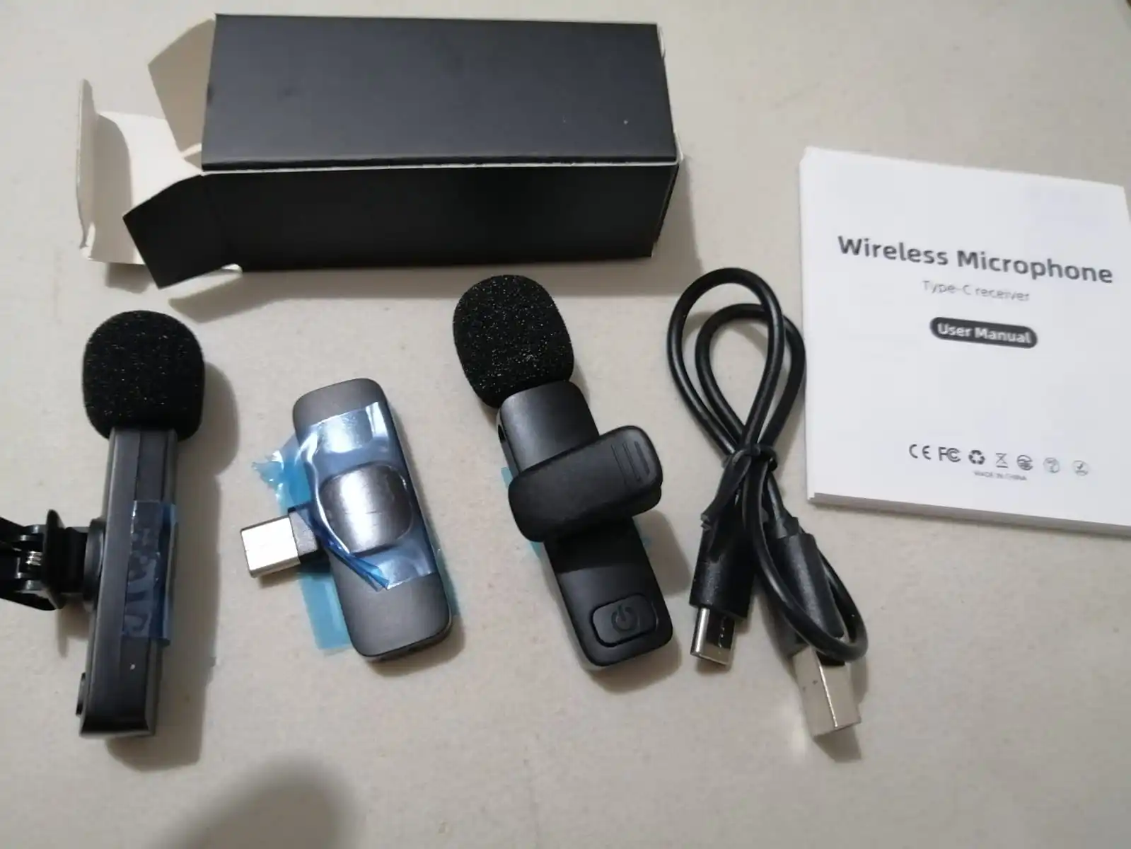 The microphone is equal to the description, it works is easy to use, the clip to hold is very simple and fixed does not turn, I bought it because I wanted a non-Bluetooth mic so it wouldn't interfere with WiFi networks, But despite that, it still interferes doesn't specify anywhere that type of wireless technology uses this mic, the quality is not professional grade as they say, but is acceptable for the price. It doesn't come in box but it comes well packed
